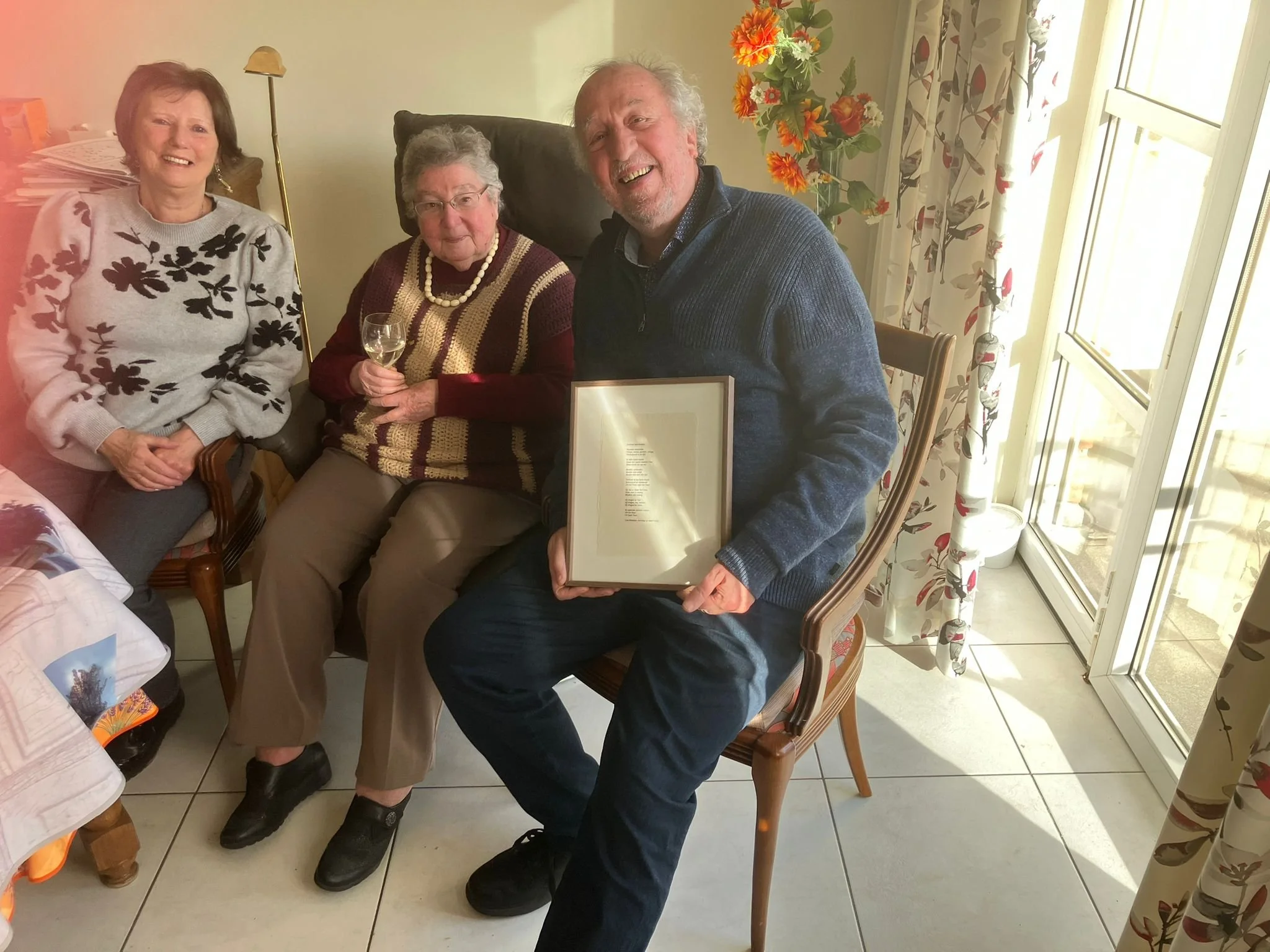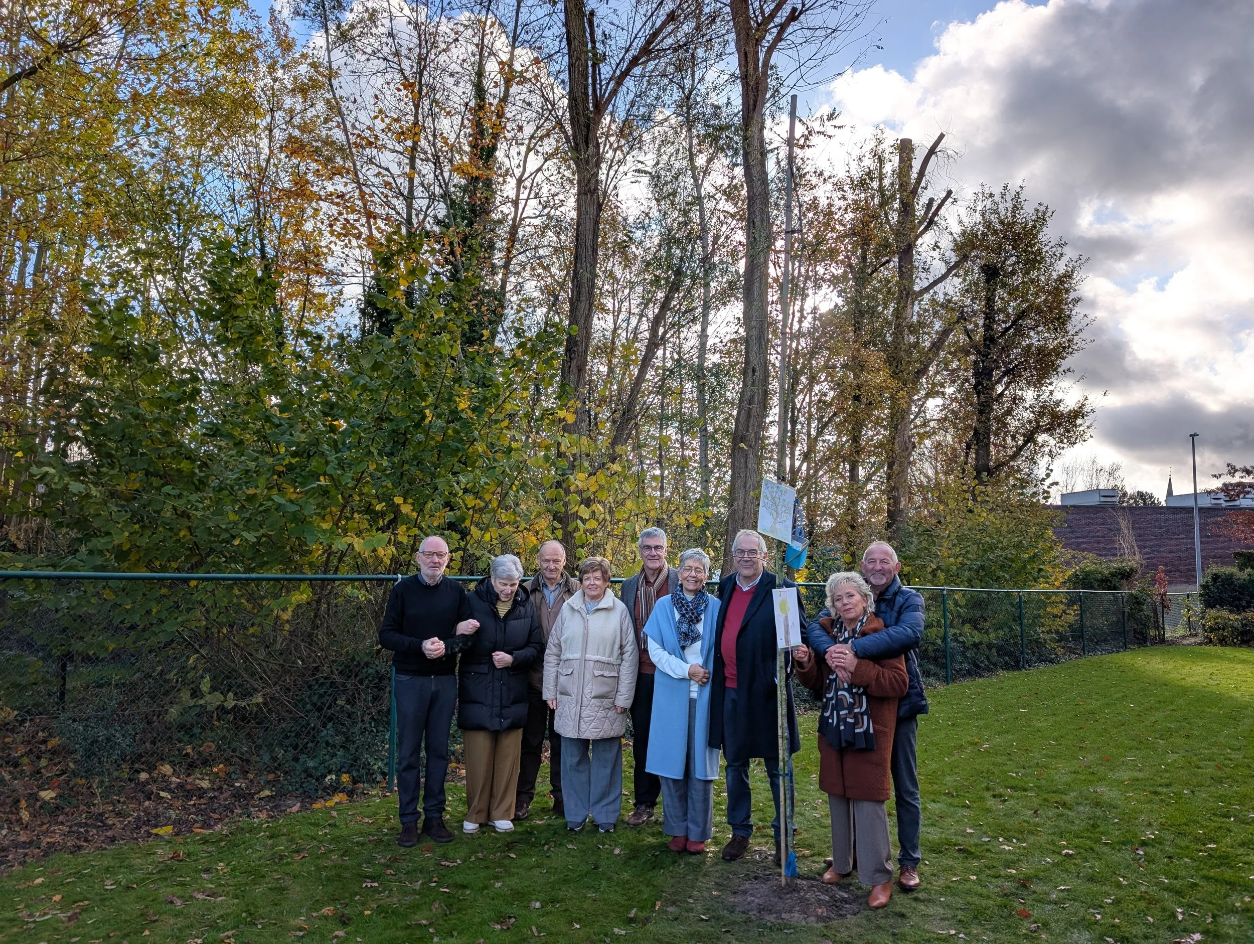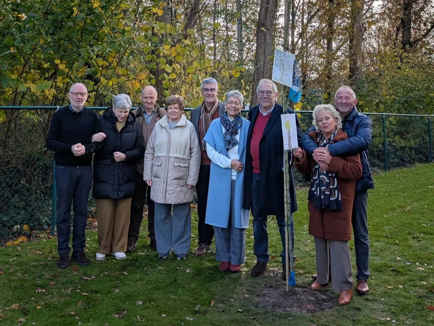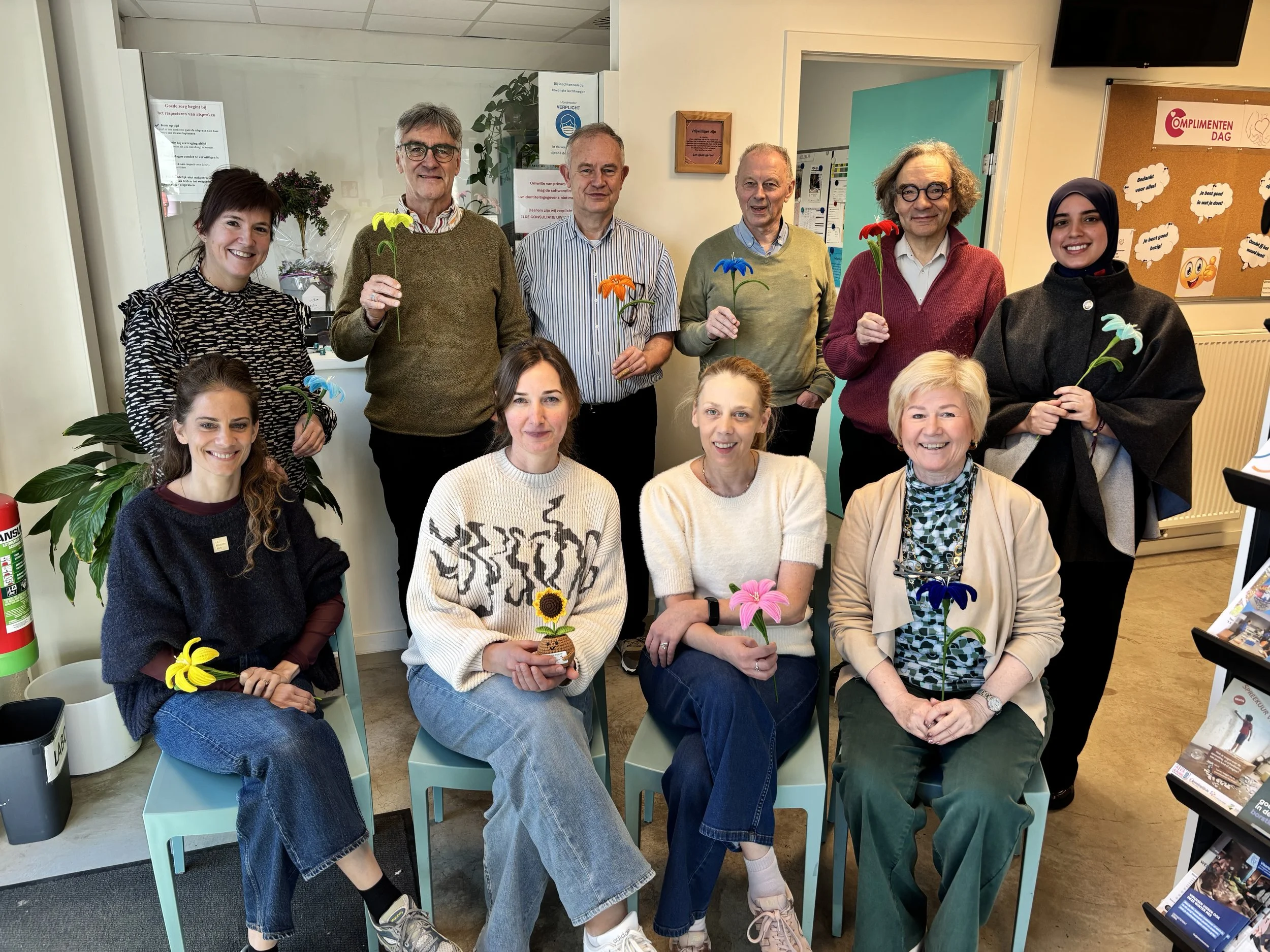 Deze foto is genomen in maart 2026 op de dag van de vrijwilliger. Iedereen met een bloem in de hand. Ook voor Goedele was er een bloem… die Bart voor haar vasthoudt. Goedele maakte deel uit van het medisch team. Bart is nog steeds lid van het bestuursorgaan van het Wijkgezondheidscentrum