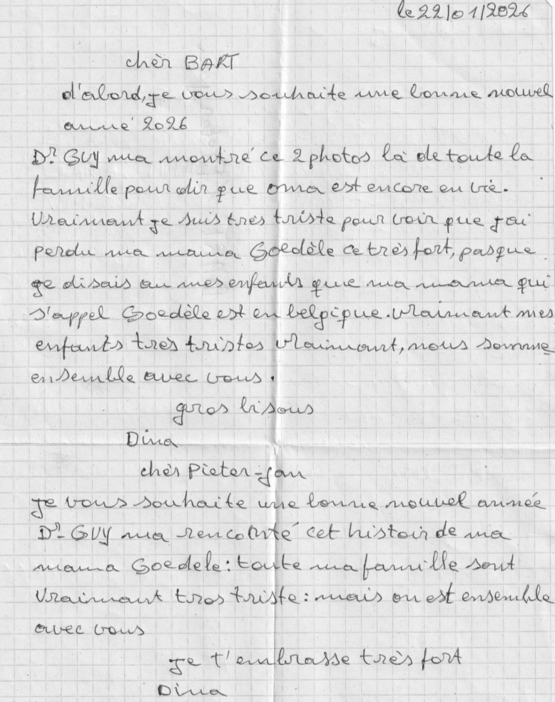 Aujourd'hui, chacun de nous a sa propre famille. Nous resterons toujours reconnaissants. Pour Maman Suzanne, Goedele était une femme douce et attentive, avec une grande écoute, et un sourire généreux. Elle se souvient des moments partagés en 2004, quand Goedele s'inquiétait de son bien-être après la perte de son mari et demandait des nouvelles des enfants. En 2022, lors d'une commémoration du notre papa, Goedele nous avait envoyé un témoignage vidéo de ses souvenirs: un geste de cœur qui nous a profondément touchés.